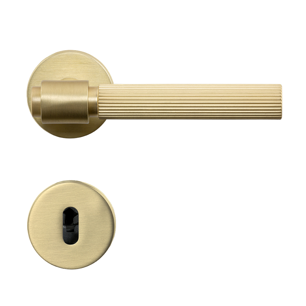 Dørhåndtag Helix Stripe i messing har en ribbet overflade med striber, der skiller sig ud med et industrielt design. Dørhåndtaget har en fjedrende fjeder, hvilket betyder, at håndtaget altid vender tilbage til sin grundposition. Perfekt til alle døre indendørs. Du er velkommen til at matche dørhåndtaget med et dørstop eller køkkenhåndtag i samme serie for at få en helhed i det indre af hjemmet.