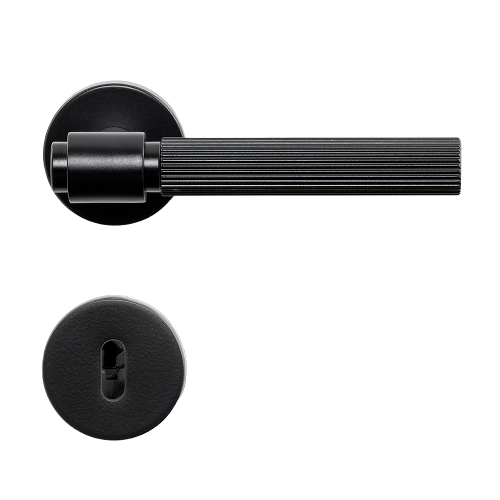 Dørhåndtag Helix Stripe i sort design har en ribbet overflade med striber, der skiller sig ud med et industrielt design. Dørhåndtaget har en fjedrende fjeder, hvilket betyder, at håndtaget altid vender tilbage til sin grundposition. Perfekt til alle døre indendørs. Du er velkommen til at matche dørhåndtaget med et dørstop eller køkkengreb i samme serie for at få en helhed ind i hjemmet.