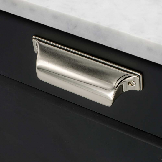 Skålgreb Timjan er et stilfuldt og tidløst håndtag med retro-fornemmelse. Perfekt egnet til køkken skuffer og bureauer i både moderne og landligt køkken. Fås i tre forskellige designs, sort, forniklet og rustfrit look. Kombiner skålgrebet med knop Mynta for et ensartet udtryk i køkkenet, soveværelset, stuen eller badeværelset.