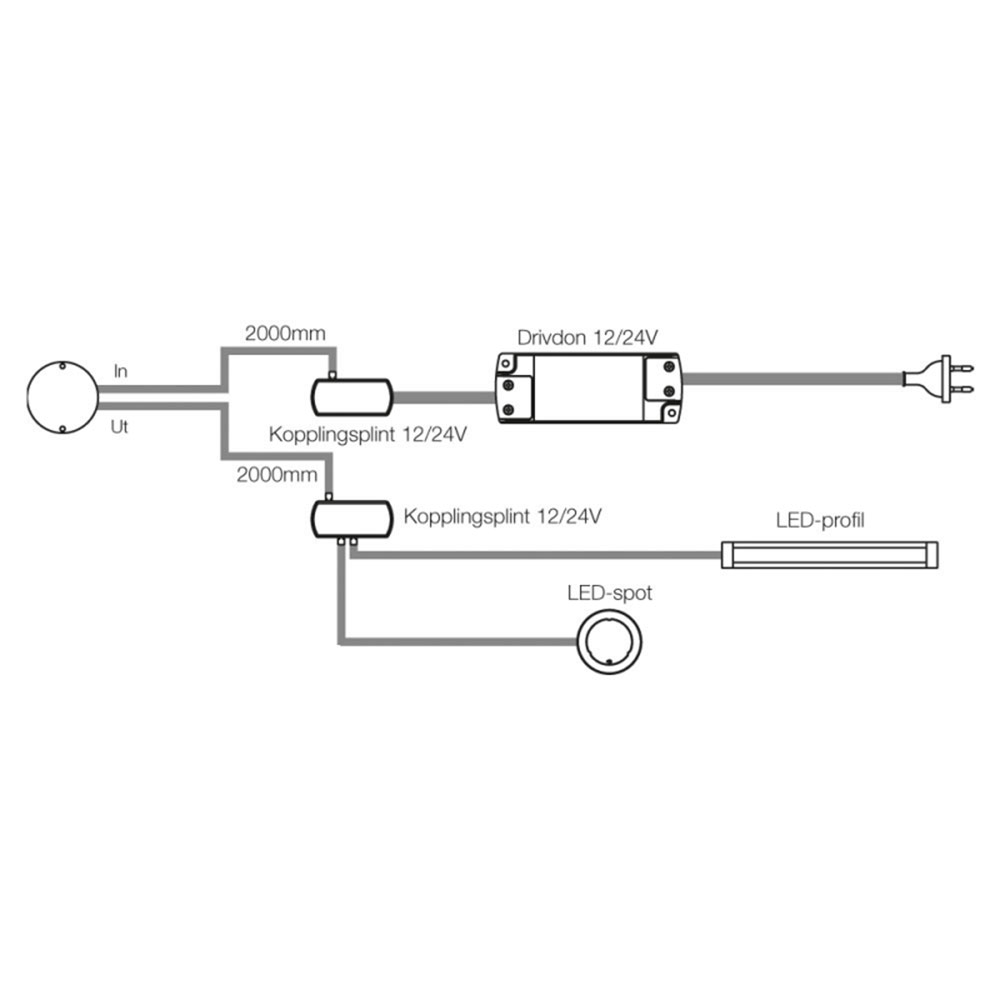 - Inkl. 2000 mm tilslutningskabel og klemrække med 12 tilslutninger, skrue, dobbeltsidet tape og et klistermærke med tænd / sluk-symbol.