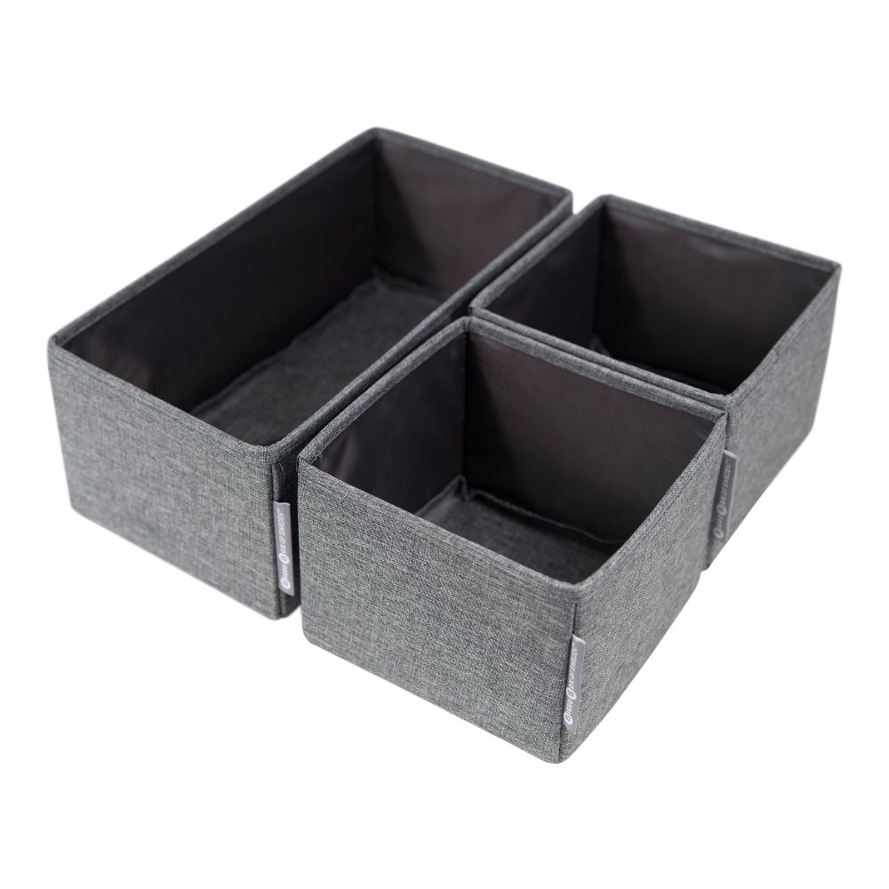 Denne praktiske opbevaringsløsning består af tre dele – én større kasse og to mindre – perfekte til at organisere alt fra undertøj og strømper til accessories og småt tøj. Sættet kommer i en blød grå nuance, der passer ind i de fleste hjem og garderober.